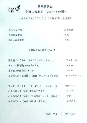 ★9月27日茶話会:フルート編~秋の午後をさわやかな響きとともに